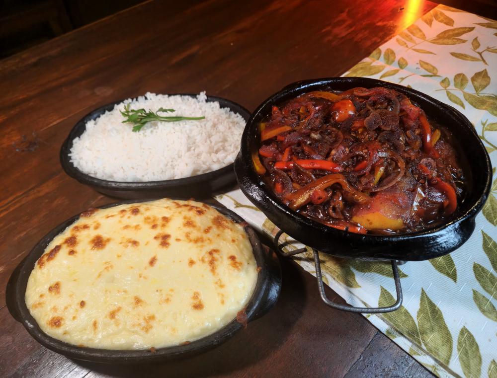 Filé mignon no shoyo, mussarela, banana, molho de legumes, arroz branco, feijão em calda.