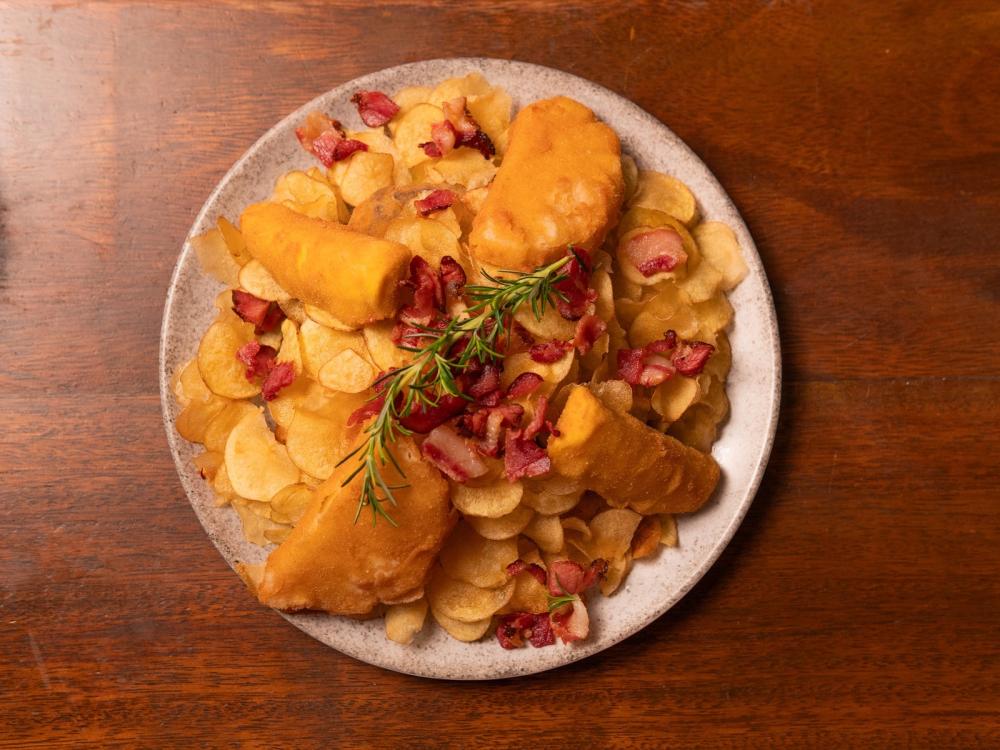 450 g de Filé mignon, abacaxi empanado, banana empanada, batata chips, bacon, arroz à grega.