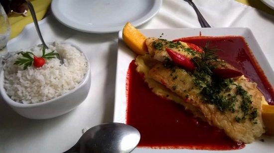 450 g de peixe ao molho de pitanga ou manga, purê de aipim e arroz.