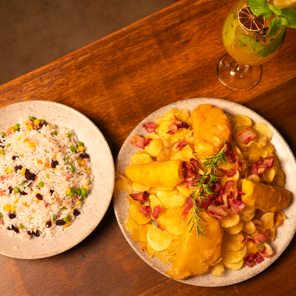 450 g de Filé de frango, abacaxi empanado, banana empanada, batata chips, bacon, arroz à grega.