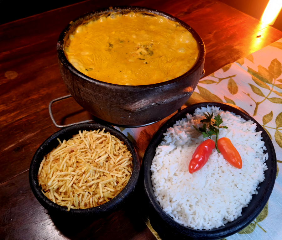 Camarão, creme especial, palmito, champignon, arroz branco e batata palha.