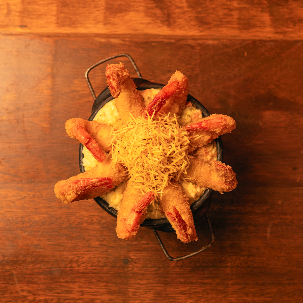 Arroz cremoso com camarão Pq e 8 camarões Vg empanado.