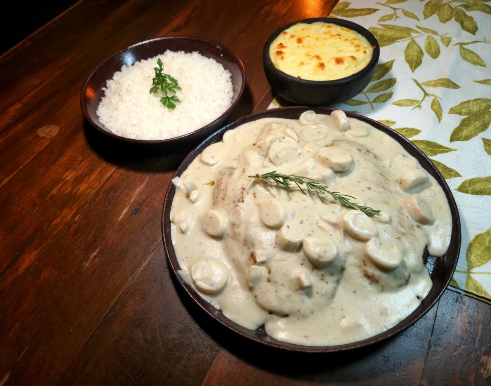 450 gramas de Filé de budião, molho branco com palmito e champignon, arroz branco.